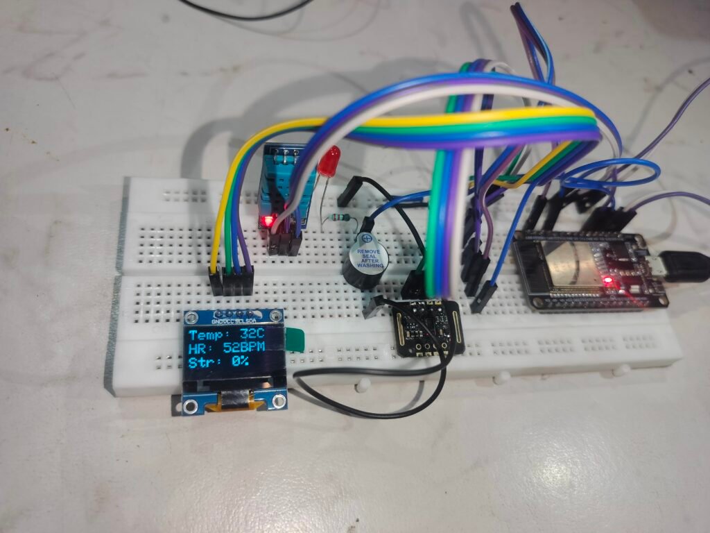 using esp32 we can measure live temperature, heart rate and stress level using max30102 sensor and dht11 temperature sensor and live monitoring on oled screen display and panic situation alert.